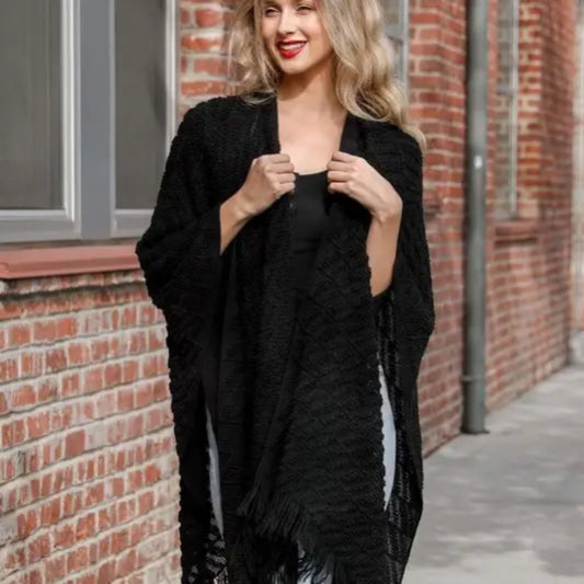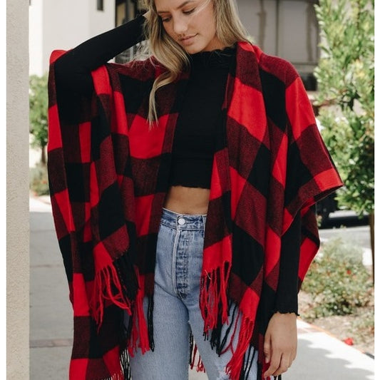 Fringed Buffalo Plaid Print Red and Black Ruana / Shawl