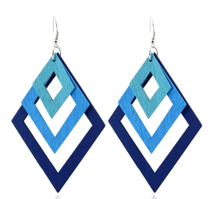 Shop the trends! Diamond Shaped Blue toned lightweight wood style earrings. Stay in style with AMMA JO!
